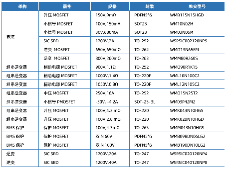 随着全球光伏需求的快速增长,维安加快布局光伏行业业务,除了微型逆变器,维安对组串逆变器及储能变流器和相关的BMS这些未来景气度较高的细分领域,都有相应的产品和方案来配套。为方便快速选型,下表为维安在逆变器和储能应用中常用物料规格型号。